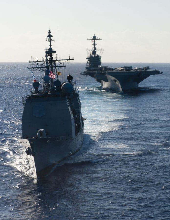 Un portaaviones estadounidense en despliegue jamás está solo. Como guardaespaldas de protección, hay siempre un buque de guerra navegando cerca, raras veces más allá del horizonte, teniendo cuidado de cualquier amenaza y listo para actuar si fuera necesario.