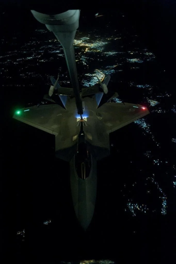 La formación de 4 F-22 Raptor recibió la mayor cantidad posible de combustible del KC-10 Extender para luego iniciar su ascenso hasta el área del objetivo. A 200 millas de la frontera siria, los F-22 aplicaron los postquemadores, acelerando a Mach 1.5 y ascendiendo hasta los 40000 pies –la altitud de crucero prevista para los 15 minutos de vuelo sobre Siria.