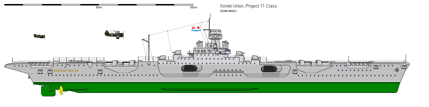 Durante el mismo período, diseñadores soviéticos y extranjeros colaboraron para crear un diseño más tradicional de portaaviones, llegando a lo que se conoció como Proyecto 71 a mediados de 1939. El pequeño portaaviones, con un desplazamiento de 11.300 toneladas, debía estar armado con 8 cañones universales de 100 mm, 16 cañones de 37 mm y 20 ametralladoras de 12.7 mm. La nave habría llevado 20 aviones, lanzados usando 2 catapultas. La Armada aprobó el proyecto, y la primera nave habría sido botada en 1942. La guerra congeló los planes. Los diseñadores continuaron su trabajo, creando el Proyecto 72 mejorado en 1944, pero ninguno de los dos proyectos vería la luz del día.