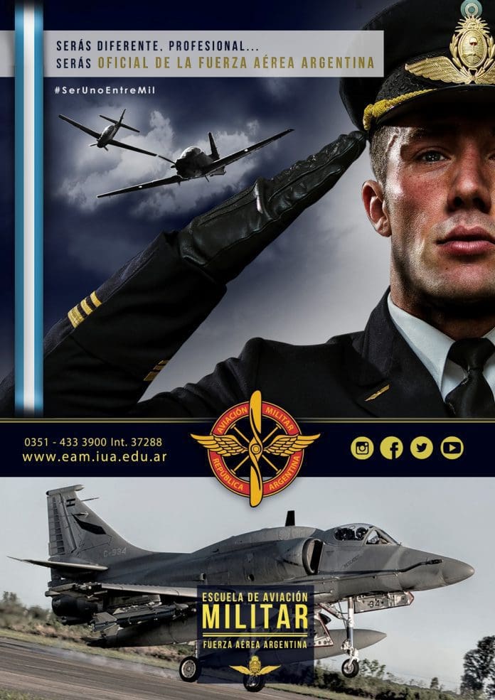 La Escuela de Aviación Militar abrió sus inscripciones para el ingreso a la Carrera de Oficial de la Fuerza Aérea Argentina, estando dirigida la misma a todos aquellos jóvenes que deseen SER UNO ENTRE MIL, para proteger nuestra Nación con CUERPO, ALMA y ALAS. Mediante una formación integral de nivel universitario de cuatro años de duración, los Cadetes optan por una de las diecisiete especialidades en las que se desempeñan los Oficiales de la Fuerza Aérea, en Argentina o durante las misiones de paz en el exterior.