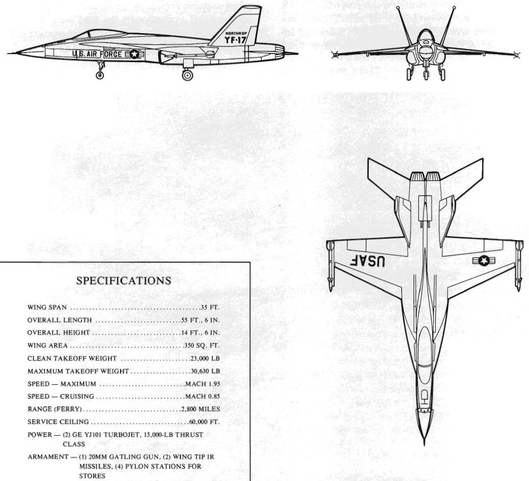El YF-17 era un monoplaza bimotor (los motores izquierdo y derecho eran intercambiables, y cada motor utilizaba un sistema hidráulico independiente.) de la categoría de 9.000 kg, con una alta relación empuje/peso y una baja carga alar para una máxima maniobrabilidad. Su avanzada tecnología de propulsión fue desarrollada, e integrada, codo a codo con su avanzada aerodinámica, sistemas de control y estructura. El bimotor YF-17, explicaba Northrop a todo el mundo, podía ser producido más económicamente que el P-610 Cobra, una variante monomotora del mismo avión.
