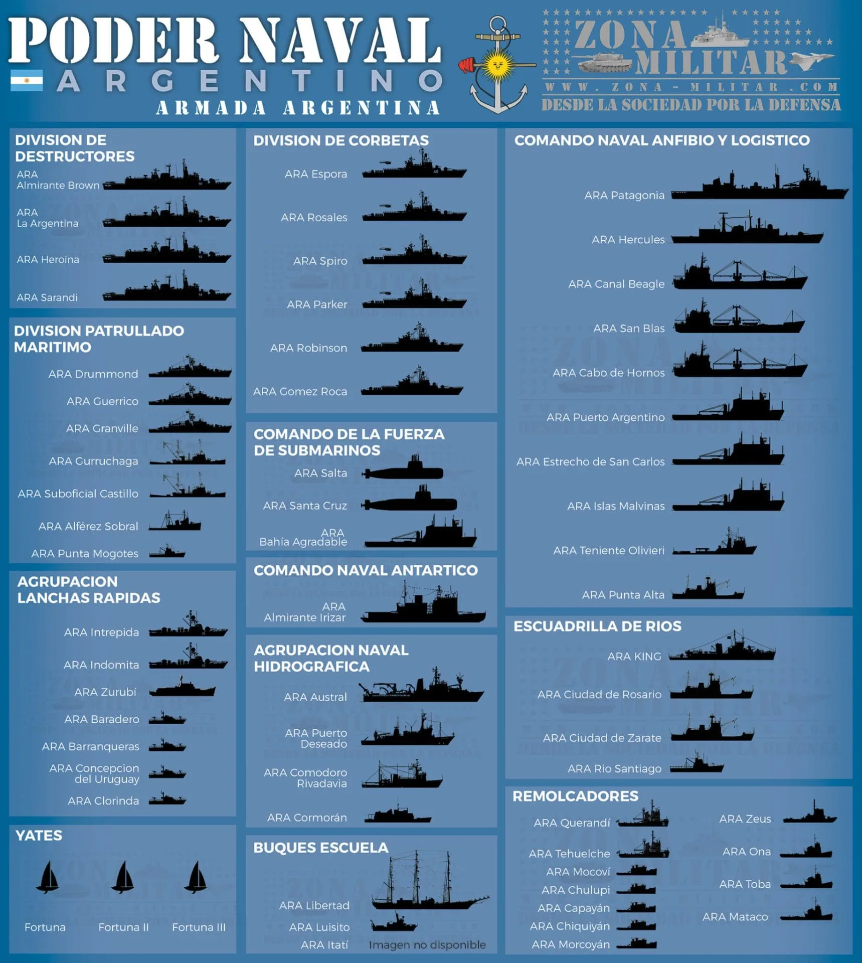 Desde Zona Militar, armamos una infografía actualizada con valores estimativos de como esta compuesta en la actualidad, el Poder Naval Argentino.
