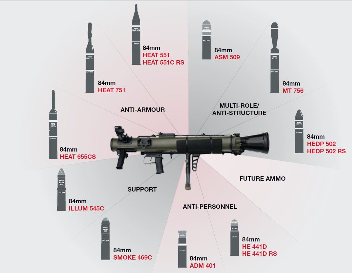 La verdadera capacidad multipropósito del Carl Gustaf se aprecia en la disponibilidad de munición de 84mm, la cual puede ser:
