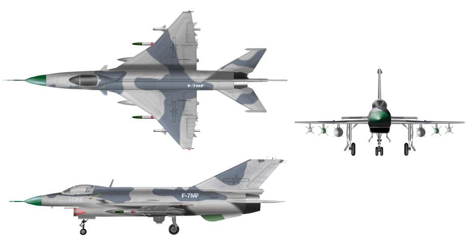 La configuración final del F-7MF se exhibió en público por primera vez en la exposición de ZHUHAI 2000. El F-7MF definitivo presentaba una toma de aire ventral similar a la utilizada en el J-10 de la compañía. Incluso a los lados de la cabina se añadieron pequeñas planos canard fijos. Debido a todo esto se tuvo que rediseñar toda la pata del tren de aterrizaje delantero y su alojamiento.