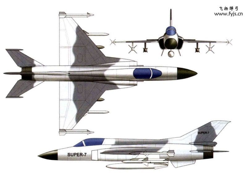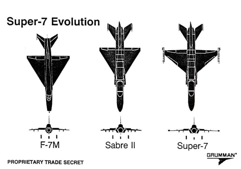 En enero de 1987, China firmaba con la compañía estadounidense Grumman un contrato por un valor de USD 550 millones para mejorar el caza J-7 en la modernización denominada “Super 7”. El J-7, basado en el caza soviético MiG-21, debía obtener una nueva y moderna motorización, radar, aviónica y armamento mejorados. Para los contratos individuales de los equipos compitieron principalmente empresas estadounidenses y británicas. El principal cambio con respecto a su predecesor debería haber sido el voluminoso radomo frontal con espacio suficiente para un radar multimodo. Las tomas de aire del motor ubicadas a ambos lados del fuselaje eran del tipo semi-circular con separadores de capa límite convencionales. La parte trasera del caza se mantuvo con ligeras modificaciones, solo las requeridas para la instalación del motor previsto, General Electric F404 (otros competidores eran el Rolls Royce RB199 y el P&W PW1216). La máquina resultante atrajo, denominada Sabre II, atrajo el interés de la Fuerza Aérea de Pakistán, que buscaba un reemplazo para los obsoletos F-6 y Mirage III.