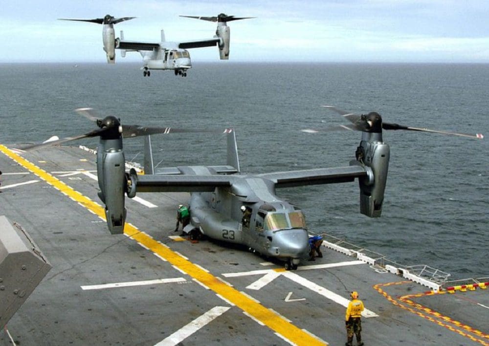 El V-22 Osprey es el principal avión de apoyo de asalto del Cuerpo de Marines de los Estados Unidos. Tiene un diseño único que utiliza motores de doble rotor para el despegue y el aterrizaje verticales que se pueden inclinar hacia adelante para el vuelo convencional del turbohélice, lo que permite una mayor velocidad y resistencia que los helicópteros convencionales.