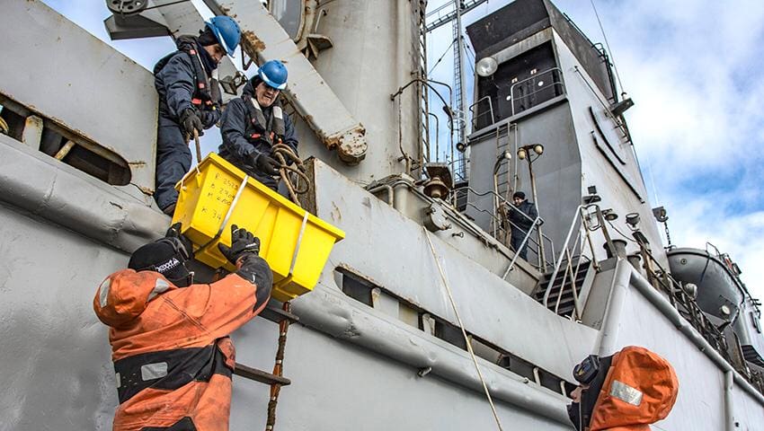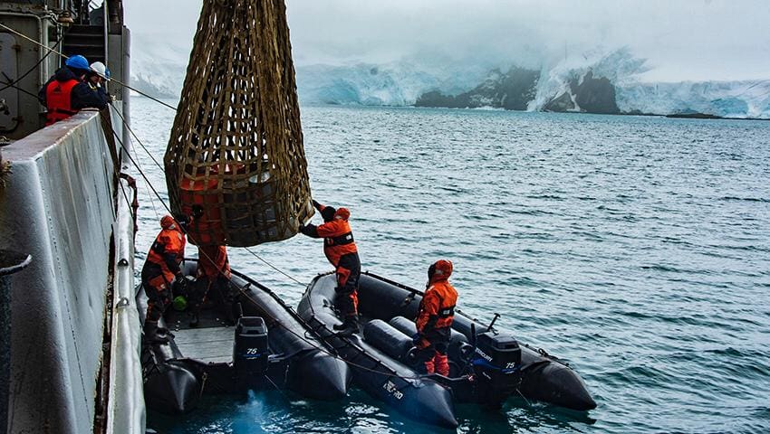 La carga transportada para las tareas de reabastecimiento es desembarcada mediante botes. Se trata de GOA (Gasoil Antártico), carga frigorizada, víveres en general y tubos de gas. Estas actividades continuarán durante toda la jornada de hoy para luego continuar con el patrullaje en aguas antárticas.