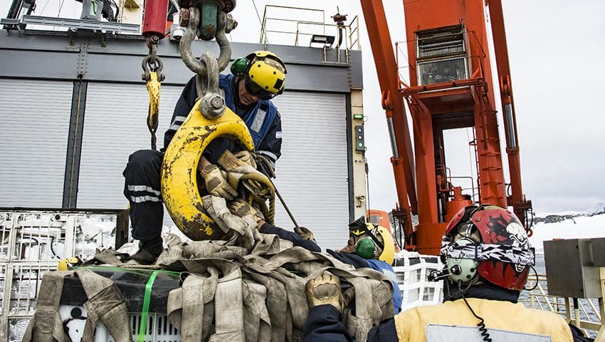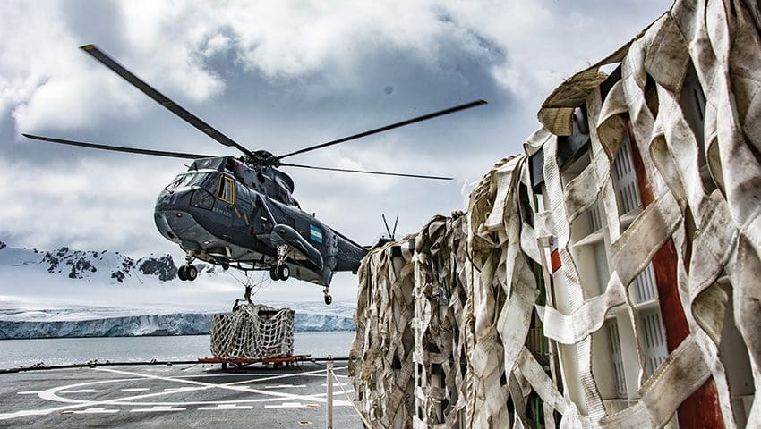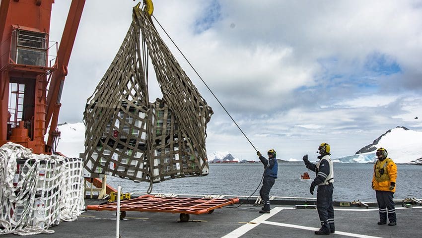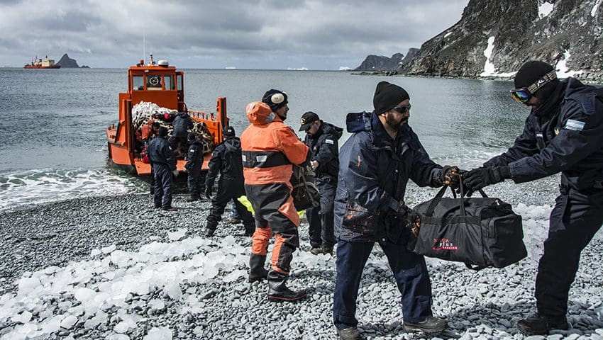 El rompehielos realizó la primera descarga en la base Orcadas, y según informó el Jefe de Operaciones del Comando Conjunto Antártico, Capitán de Navío Claudio Musso Soler, dada que las condiciones climáticas fueron excelentes, se pudo descargar “50 rolling tanks de gasoil antártico (GOA) –con helicópteros Sea King– y en lanchas baja la carga general y frigorizada más bultos personales“.