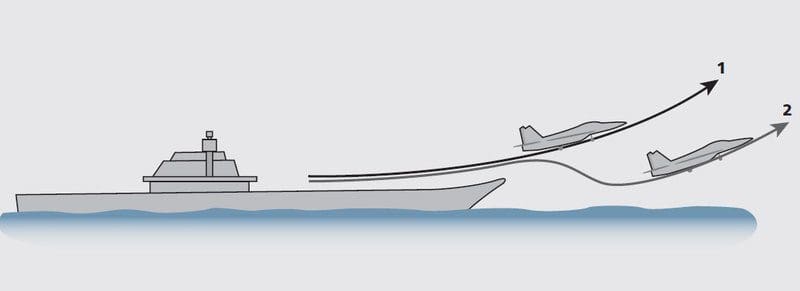 Por lo tanto, en los primeros portaaviones soviéticos, el Almirante Kuznetsov y el Varyag, se decidió aplicar la idea original: el despegue de la aeronave desde una rampa especial o trampolín, conocida como skijump en occidente. Dicen que, de alguna manera, en la exposición internacional de armas, se le preguntó al diseñador general adjunto de la oficina de diseño de Sukhoi Oleg Samoylovich, cuál era exactamente la curvatura de la superficie de la rampa. “Este es el principal secreto del portaaviones soviético”, fue la respuesta. Solo fue posible obtener que se trataba de una curva de tercer orden. Cuando el avión abandona la rampa, se encuentra en el ángulo de ataque ideal a una velocidad de 180-200 km/h (para el Su-27). La rampa tuvo tanto éxito que otras aeronaves embarcadas basadas en cazas terrestres, como el MiG-29K y el Su-25UGT, también pueden despegar exitosamente desde esta rampa. Teóricamente, una aeronave de cualquier peso de despegue puede despegar desde un skijump.