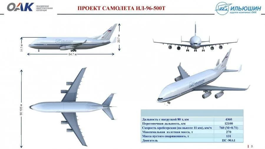 Según la presentación, el diseño conceptual del IL-96-500T se completó en 2018, cuando Ilyushin estaba encabezado por Alexey Rogozin.