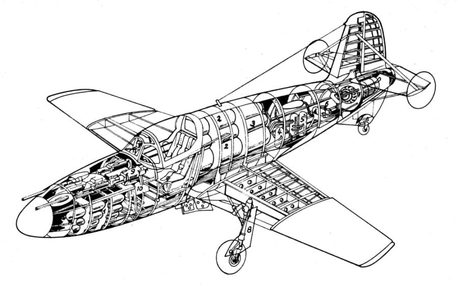 Para conseguir una posición satisfactoria del C.G., el depósito de queroseno se instaló en el morro, delante de la cabina, junto con las botellas de aire comprimido para el sistema hidráulico, la radio y el armamento; los depósitos de ácido nítrico se colocaron inmediatamente detrás de la cabina.