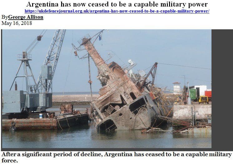 Ya nadie desconoce en la Argentina y en el exterior el descalabro de la Defensa Nacional. Hay repetidos y drásticos informes detallados elaborados en el ámbito militar al Ministerio de Defensa. En el año 2018 el fiscal Di Lello investigó la situación de la Defensa a instancias de la previsible desgracia ocurrida al Submarino ARA “SAN JUAN” a fines del 2017. “After a significant period of decline, Argentina has ceased to be a capable military force” mencionaba una reconocida publicación de Defensa británica en 2018.