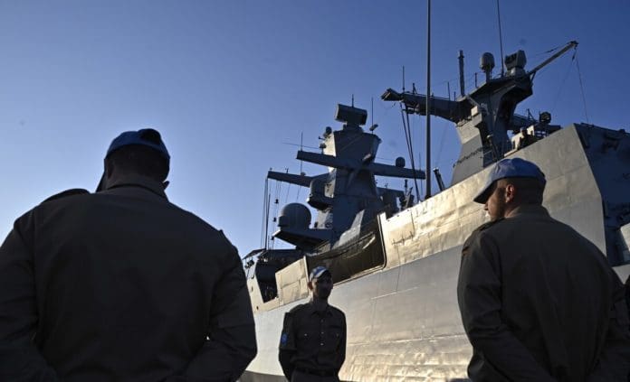 En la imagen vemos soldados alemanes en la Fuerza Provisional de las Naciones Unidas en el Líbano junto a una corbeta de la Armada Alemana el 19 de diciembre de 2019, en la ciudad portuaria chipriota de Limassol. (Tobias Schwarz / AFP a través de Getty Images)