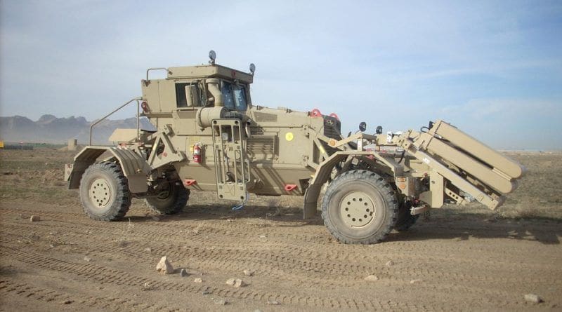 El “Husky” se usó inicialmente para detectar minas en África y luego se equipó para satisfacer las necesidades de limpieza de ruta de los soldados estadounidenses. El vehículo Husky es un híbrido de tractor y Humvee, con un casco en forma de V que resiste explosiones.