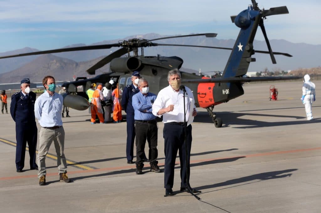 “Para realizar este tipo de traslados, el uso de los helicópteros Black Hawk es ideal para realizarlos de forma rápida y segura”, destacó el ministro de Defensa Nacional, Alberto Espina. “Este es un helicóptero que se suma a la flota de medios aéreos que usa la Fuerza Aérea y que está integrado por el avión 767, que vuela a China y otros países trayendo ventiladores y otros insumos, y al (Hércules) c-130, que puede tener hasta seis pacientes críticos de coronavirus y dos cápsulas”, agregó.