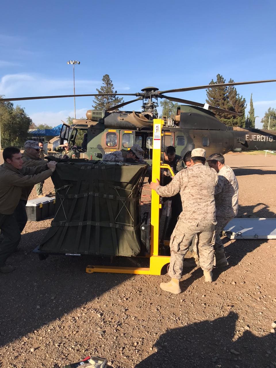 En total fueron realizados dos entrenamientos con la finalidad de transportar elementos de primera necesidad, como agua y medicamentos, a comunidades aisladas o de difícil acceso. El primero de lo ejercicios fue realizado por Brigada de Operaciones Especiales (BOE) “Lautaro”. Fueron empleados para realizar cargas por vía externa helicópteros Cougar AS-532. En total 20 efectivos, más la tripulación de la aeronave, instalaron plataformas para transportar hasta 4.500 kilogramos de carga.