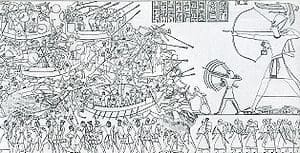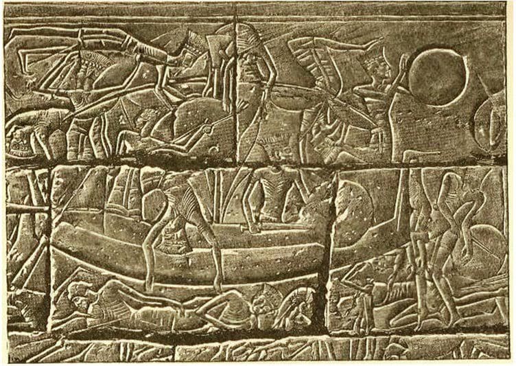 El texto de los relieves de Ramsés III en Medinet Habu, Tebas occidental, afirma que hubo un encuentro naval en las desembocaduras del Nilo en el Delta. Las medidas defensivas del rey incluían una empalizada de lanzas que se instaló en la orilla para impedir a las naves enemigas.