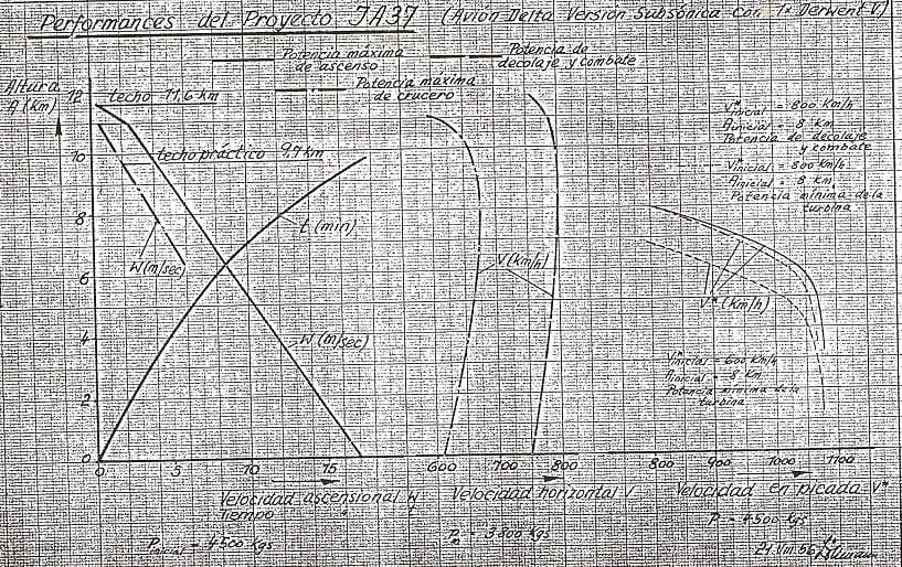 Basándose en los estudios de ensayos de vuelo de los modelos de vuelo libre y planeador, pero en especial en las conclusiones de los Ingenieros Maccipinto y Krasinski en el túnel de viento, que fueran elevados en nota tecnica que lleva por numero el 26, en el mes de julio de 1954, se determino las prestaciones teóricas de la aeronave, que da cuenta de una velocidad máxima de 800 kms/h a a 8000 metros de altura, una velocidad ascensional de 17 Mts/seg., una velocidad de aterrizaje de 110 kms/h dependiendo de la disposición a adoptarse en el tren de aterrizaje (ya veremos mas adelante) y un techo practico de 11.600 metros (determinado por cuanto con la potencia disponible a esa altura aun tenia una velocidad ascencional de 2 mts/seg. que se entendió como suficiente para maniobras de combate).