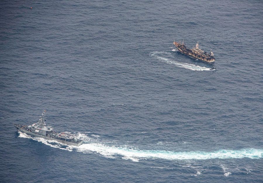 El viernes, la marina llevó a cabo una misión de patrullaje que incluyó un sobrevuelo de la región donde pescan los buques de gran tonelaje, así como un reconocimiento por parte de los buques de patrulla militar. Un total de 340 buques se encuentran actualmente en la zona, dijo la marina, en comparación con unos 260 reportados el mes pasado.