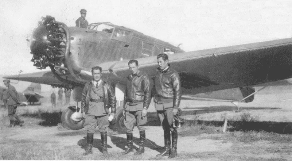 Ballivián 1934 – Cap Eleodoro Nery, My Jorge Jordán y Tte Antonio Rivera al lado del Junkers Ju43. (Víctor Meden)