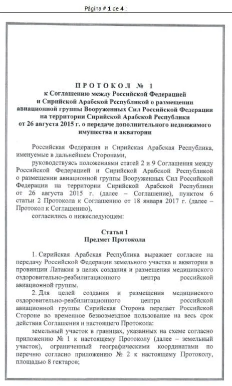 Siria acordó darle a Rusia un área adicional de tierra y agua para expandir la Base Aérea de Khmeimim. En agosto de 2015, ambos países firmaron un acuerdo, denominado Protocolo 1°, que establecía el despliegue y permanencia de un grupo de aviación ruso en Siria. Para este propósito Siria proporcionó el aeródromo de Khmeimim, ubicado a 25 km al sur de Latakia. El protocolo del acuerdo inicial del año 2015 se encuentra disponible en el sitio web del Kremlin.