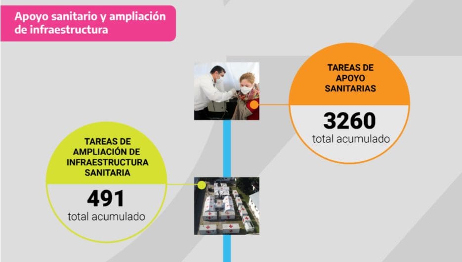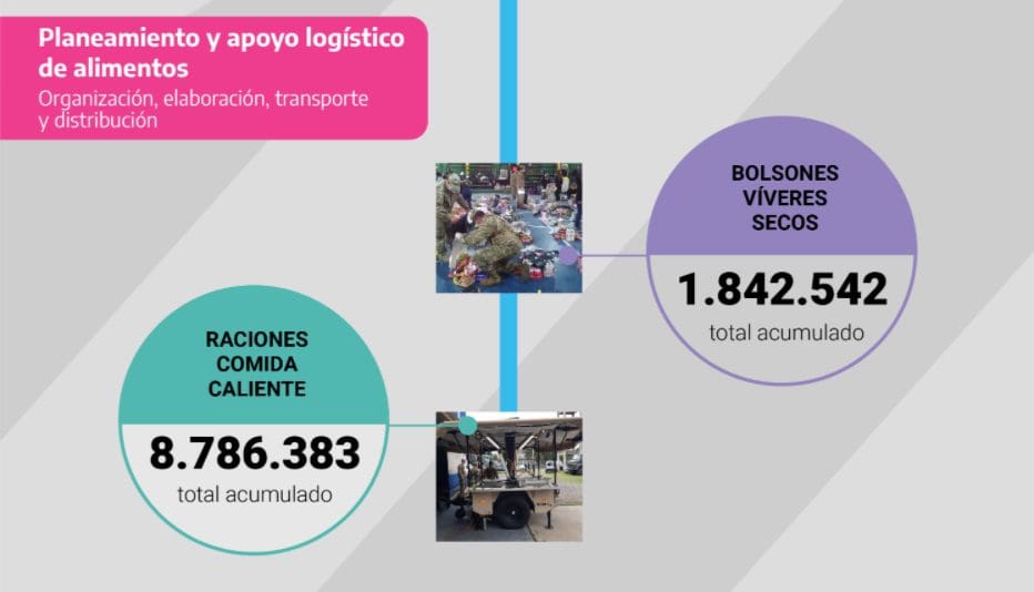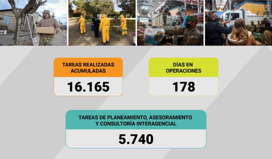 En total, el despliegue de las Fuerzas Armadas en el Operativo General Belgrano ya lleva realizando más de 16.165 tareas en 178 días. De las tareas realizadas, se destacan la distribución de bolsones de comida en zonas precarias, la distribución de insumos médicos y la atención de pacientes en zonas precarias, aisladas o de difícil acceso.