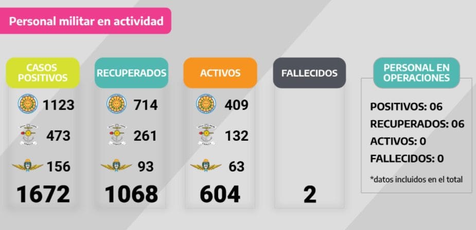 Sobre los casos de coronavirus entre las Fuerzas Armadas, el ministerio comunica que no se han registrado nuevos casos. Al 15 de septiembre la cifra arroja 0 casos de fallecidos por COVID-19 en personal en operaciones.