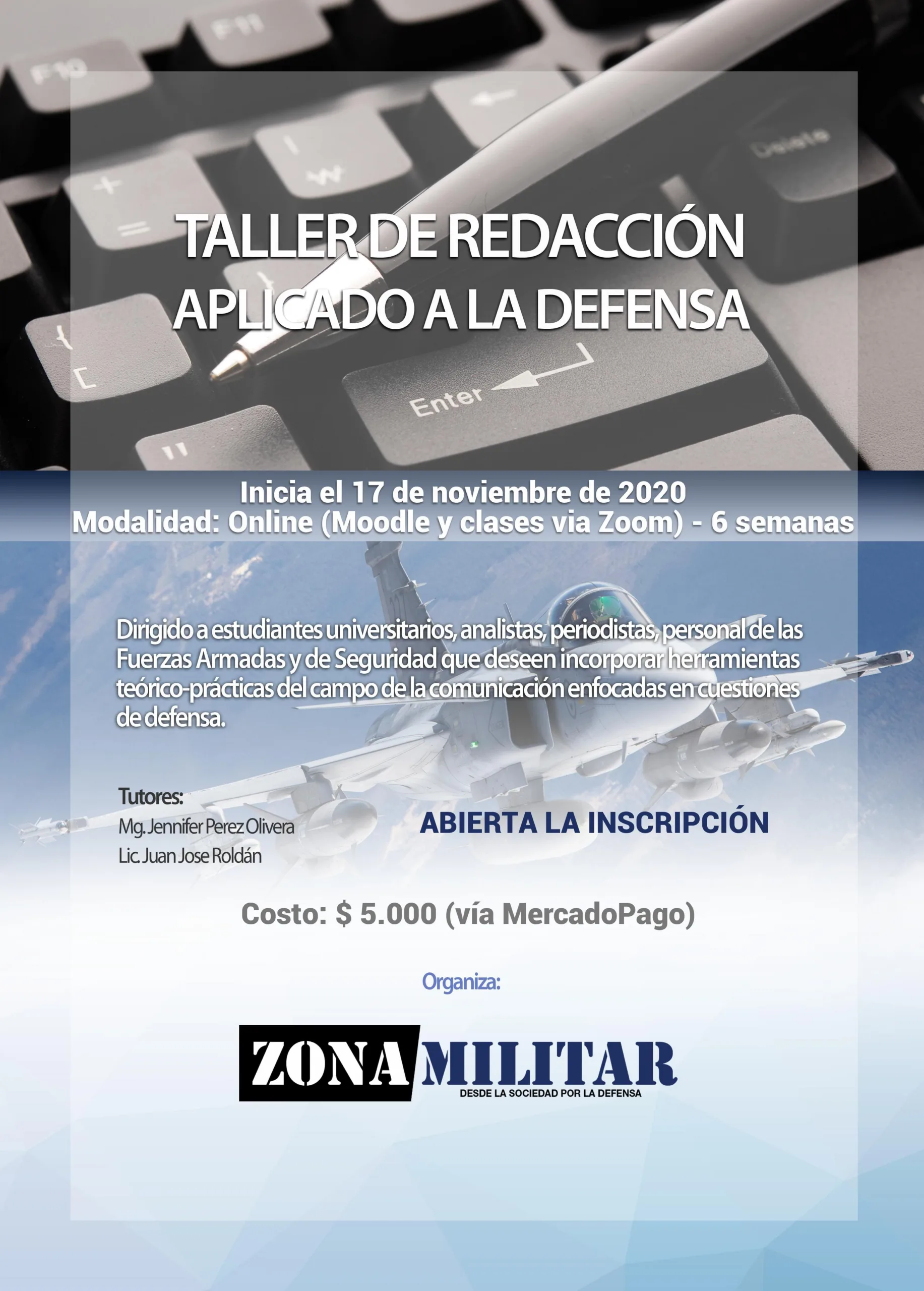 Nos complace anunciar que Zona Militar lanza una nueva iniciativa. El Taller de Redacción aplicado a la Defensa esta dirigido a estudiantes universitarios, analistas, periodistas, personal de la Fuerzas Armadas y de Seguridad, que deseen incorporar conocimientos y herramientas teórico-prácticas aplicadas al campo de la comunicación enfocada en la Defensa Nacional.