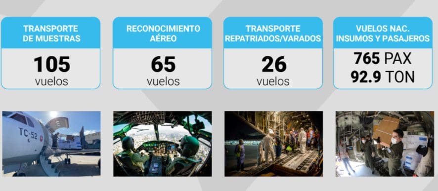 Sobre las operaciones aéreas, se realizaron 105 vuelos de transporte de muestras, 65 vuelos de reconocimiento aéreo, 26 vuelos de transporte de repatriado y varados y 765 pasajeros fueron trasladados en vuelos nacionales.