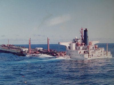 Como el calado de esas embarcaciones les impedía cruzar el Canal de Panamá, la travesía se hacía a través del Cabo de Hornos, bordeando el litoral americano hacia el extremo sur por el océano Atlántico y remontando por el Pacífico hasta su destino final. El gigantesco VLCC (Very Large Crude Carrier) estadounidense, ostentaba bandera liberiana (bandera de conveniencia)*, hizo una primera escala en Río de Janeiro para reabastecerse de combustible, agua y provisiones.