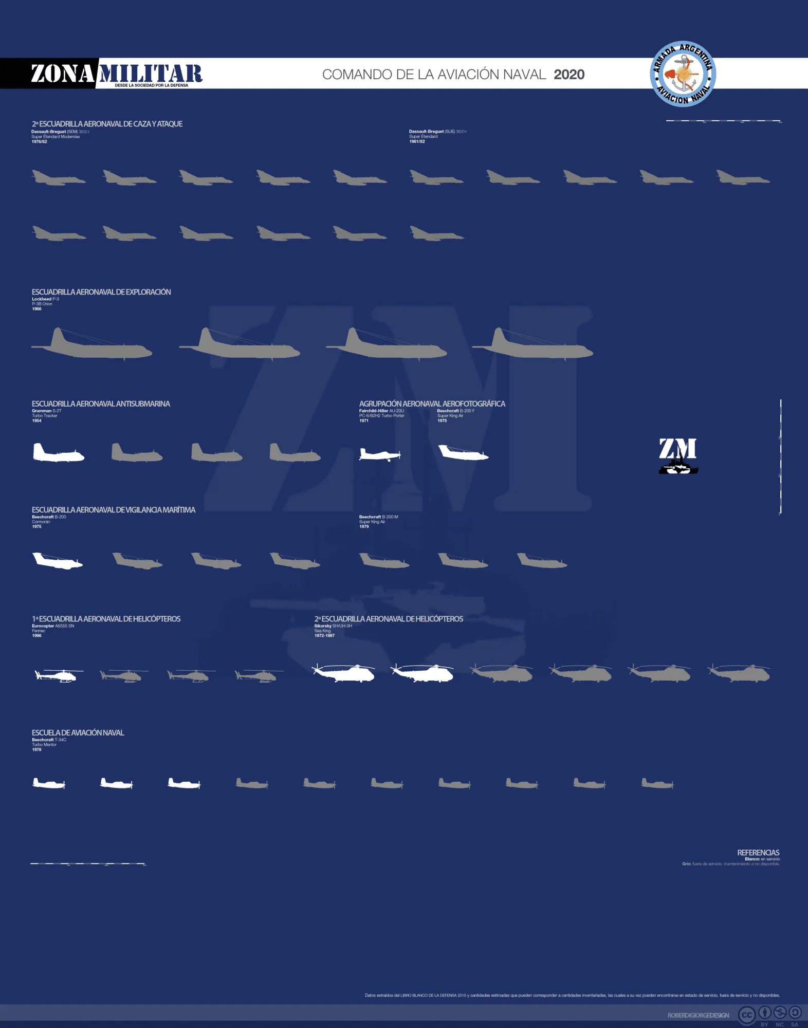Durante el 2020 el equipo de Zona Militar fue trabajando en una serie de infografías que plasmaban el componente instrumental de las distintas fuerzas del instrumento militar argentino. En esta oportunidad compartimos con la comunidad la infografía sobre el poder de la Aviación Naval Argentina (COAN) dependiente de la Armada Argentina, durante el 2020, mencionando los medios con los que cuenta la fuerza.