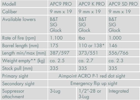 - APC9 PRO G (SMG): Versión básica, operada por retroceso de cerrojo cerrado y acción de retroceso simple. Culata plegable de polímero