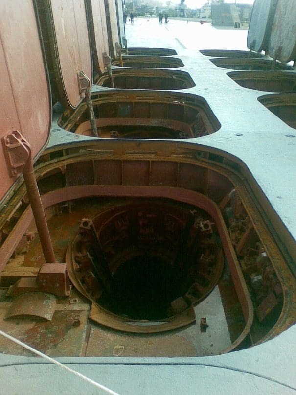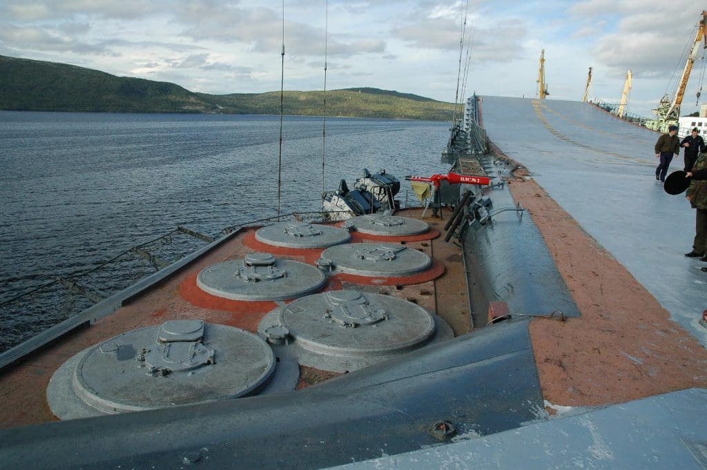 La tapa de los silos del P-700 Granit, integrados con la cubierta del Kuznetsov.