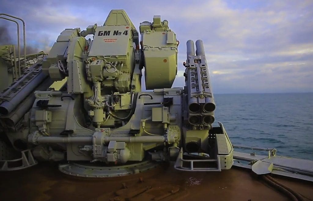 Kortik en acción disparando los dos cañones tipo gatling de 6 tubos de 30 mm