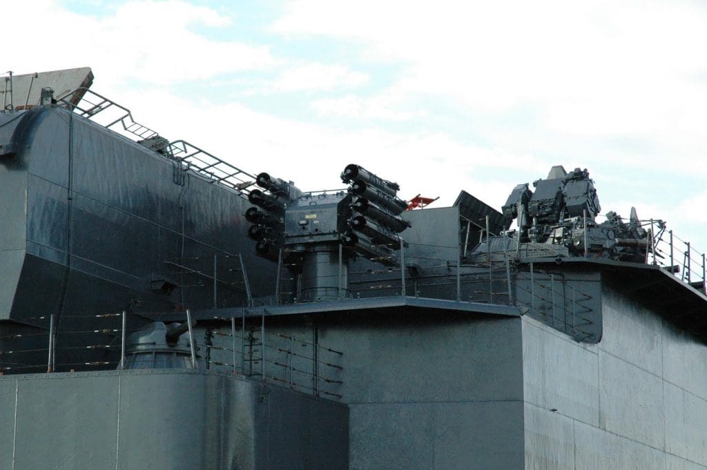 El Almirante Kuznetsov está equipado con no menos 4 lanzadores séxtuples VLS (sistemas de lanzamiento vertical) de misiles antiaéreos 3K95 Kinzhal, con seis celdas de misiles cada uno. Estos disparan el misil de defensa aérea 9M330 / SA-N-9 “Gauntlet”, y se transportan en total la friolera de 192 de estos misiles. Además, la nave se eriza con un muro virtual de sistemas de armas de defensa puntual (CIWS), incluidos seis cañones gattling AK-630 de 30 mm y no menos de ocho (notoriamente formidables) sistemas CIWS de misiles / cañones Kashtan (cañón CADS- N -1y misiles Kortik / SA-N-11). El barco incluso luce sus propias defensas antisubmarinas con un par de sistemas de cohetes antisubmarinos / antitorpedos UDAV-1 (RBU12000 AS) con 60 proyectiles en total. Aunque el sistema UDAV-1 es un concepto menos complejo, los portaaviones estadounidenses apenas están comenzando a desplegar una defensa capaz contra los torpedos en la actualidad.