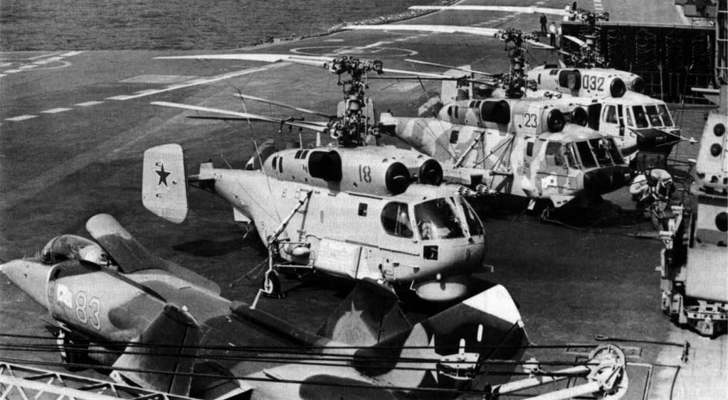 La clase Kiev (Proyecto 1143 Clase Krechyet) que se lanzó en la década de 1970 fue un desconcertante compromiso cruzado entre un crucero misilístico pesado y un portaaeronaves capaz de llevar helicópteros y cazas tácticos VTOL Yak-38, y por su diseño podría considerárselo como un crucero antisubmarino. Derivado originalmente de los clase Moskva, de los cuales heredo su problemática planta motriz, estaba pesadamente armado y equipado con sonar y modernísimos radares de vigilancia aérea y de superficie de diversos tipo a diferencia de los barcos norteamericanos que solo tenían misiles de defensa puntual y ningún tipo de sonar o armamento pesado (aunque de esto se encargaban sus escoltas).