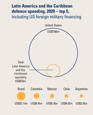 Así, la publicación muestra un balance del gasto militar para el año 2020 de la región latinoamericana y el caribe, ubicando a Argentina en un gasto de USD 2.9 por debajo de Chile con USD 4, México con USD 5.3, Colombia con USD 9.4 y Brasil con USD 22.1.