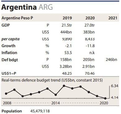 El análisis esta contextualizado en base a la respuesta que dieron las Fuerzas Armadas en cada país frente a la crisis que desató la pandemia y el estado de los recursos con lo que estas operaron. Para describir la situación Argentina, la publicación afirma que “los planes de modernización de las fuerzas armadas han sido obstaculizados por problemas económicos”, a lo que se le podría agregar la palabra “recurrentes” para lograr enfatizar la problemática dentro del contexto clásico de crisis eterna en Argentina. Luego, continúa diciendo que la recapitalización de vehículos blindados sigue “moribunda”, y que los planes de modernización naval incluyen cuatro OPV y el plan de “revivir la flota de Super Etendard Modernisé de la ex Marine Nationale que avanza despacio”. Además agrega que las prioridades de la Fuerza Aérea Argentina son el mantenimiento de la flota actual, la búsqueda de reemplazo para el Skyhawk, ya retirado, y para los aviones Mirage.