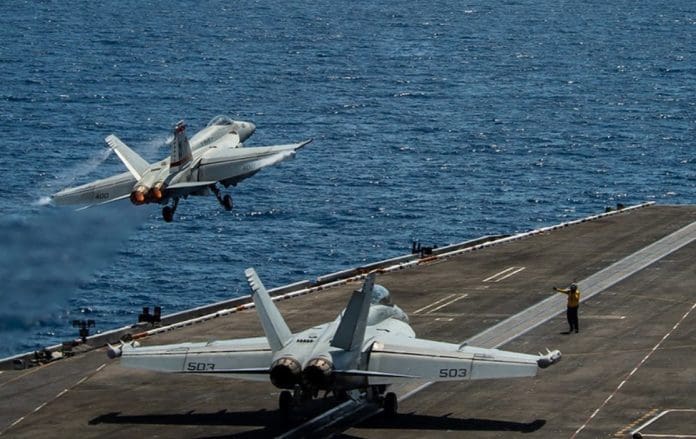 Imagen de portada: Un F / A-18E Super Hornet asignado al Strike Fighter Squadron (VFA) 87 despegando desde el USS Theodore Roosevelt (CVN 71) durante las operaciones de vuelo en el Mar de China Meridional. (Fuente de la imagen: Marina de los EE. UU.)