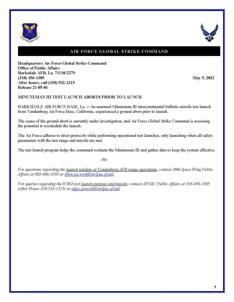 Según un comunicado de prensa emitido el 5 de mayo por el Mando de Ataque Global de la Fuerza Aérea, un lanzamiento de prueba de un misil balístico intercontinental Minuteman III no armado desde la Base Aérea de Vandenberg, California, experimentó una interrupción en tierra antes del lanzamiento.