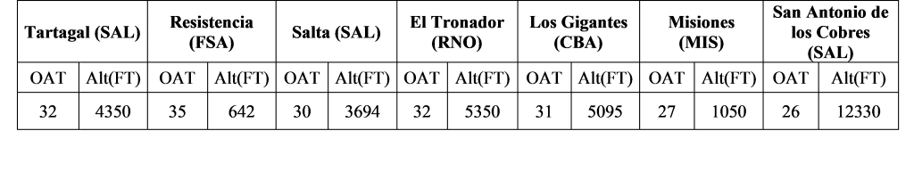 Para realizar la comparación, se eligieron lugares de operación en nuestro país donde las condiciones son extremas por su altura, temperatura o una combinación de ambas. Como la temperatura ambiente influye en el desempeño de una aeronave, se decidió usar la elevación y temperatura externa (OAT) promedio en época de verano en lugares donde es previsible que operen helicópteros militares.