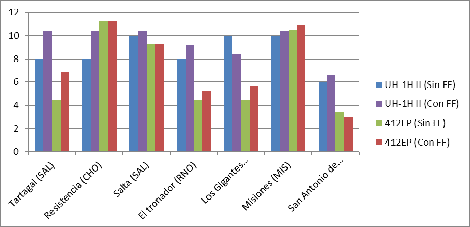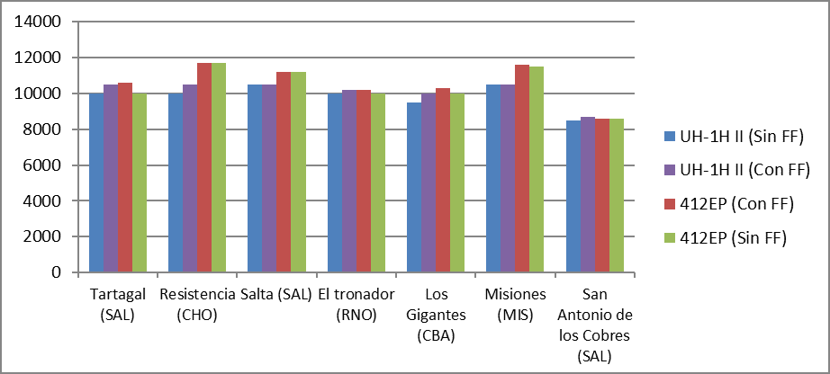 Los siguientes gráficos comparan el Huey II y el Bell 412EP en una misma situación. Para ello cual, tomaremos como referencia los datos de la Tabla 1 para trabajarlos en función del siguiente escenario.