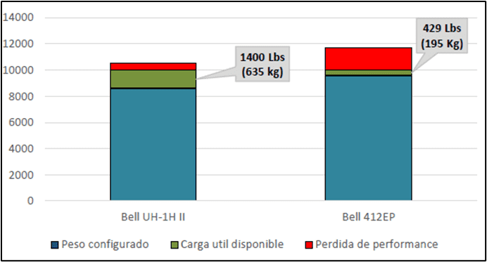 La primera conclusión es que, si bien cuando se compara la performance en cuanto al peso máximo de despegue que ofrece cada sistema en estas condiciones el UH-1H II es superado en un 90% de los casos por el Bell 412EP en sus variantes, el Huey II permite un mayor aprovechamiento de la relación peso/potencia, lo que le permite transportar mayor o igual cantidad de personal.