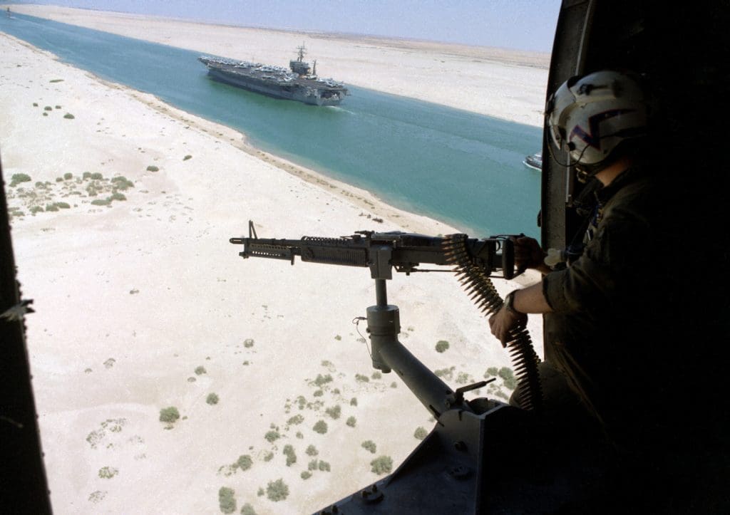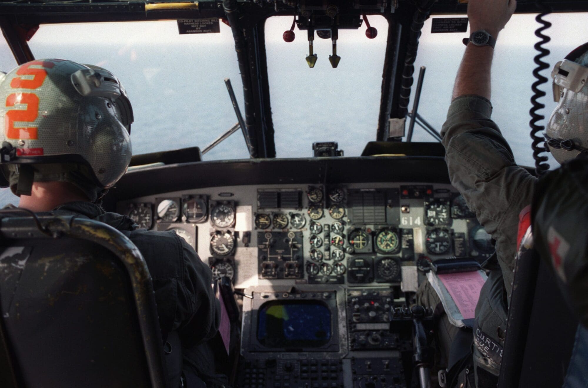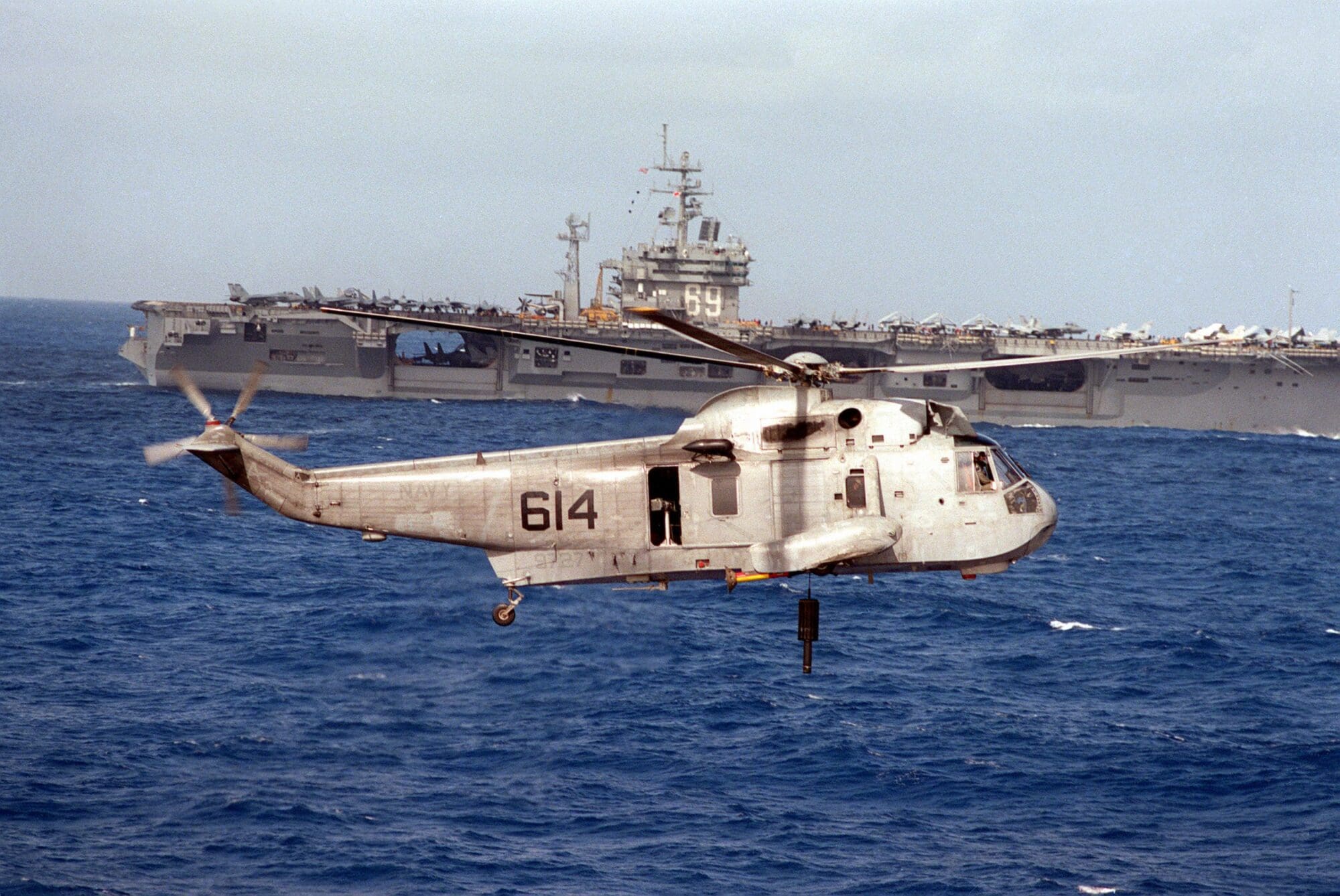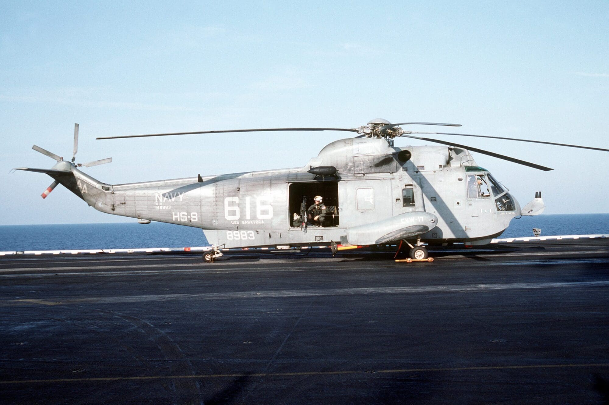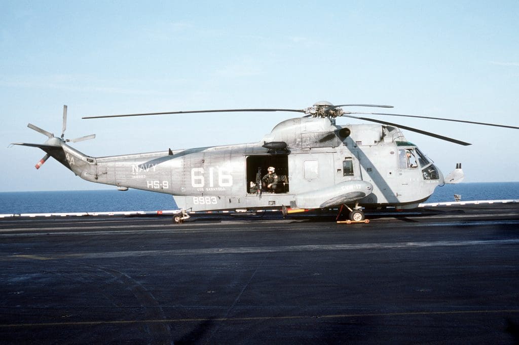 SH-3H Sea King del HS-9 a bordo del portaaviones USS Saratoga. Se aprecia el afuste y la ametralladora M-60. El objeto rojo y amarillo forma parte del MAD. Foto: US BNavy
