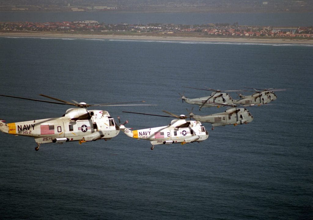 Formación de SH-3H Sea King pertenecientes Helicopter Anti-submarine Squadron 2. Se aprecian las barquillas de lanzadores de bengalas/chaff Foto: US Navy