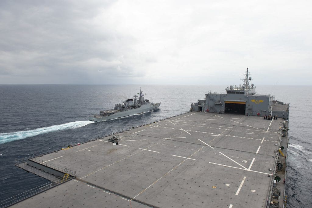 Como primera parte de su itinerario, el 22 de agosto, la fragata Independência (F-44) realizó diversas ejercitaciones junto al USS Hershel “Woody” Williams, base móvil expedicionaria de la Clase Lewis B. Puller. Efectivos brasileños efectuaron diversos entrenamientos realizando simulacros de Visita, Abordaje, Búsqueda y Captura (VBSS, por sus siglas en ingles). Recientemente, la base expedicionaria de la US Navy ya había realizado diversas ejercitaciones con fuerzas de la región, como la Marina de Nigeria y Ghana.