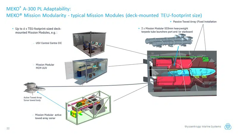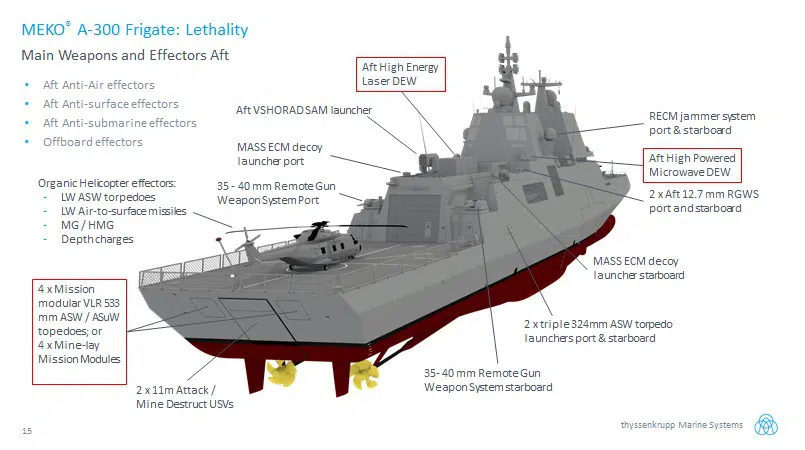En base la información e infografías que fueron parte de la presentación, las MEKO A-300 son fragatas polivalentes, fuertemente armadas y equipadas para desempeñar misiones de guerra antisubmarina, antisuperficie y de defensa aérea, teniendo como marco de acción el complejo escenario que reina en el Mar Báltico. Sus principales características serán su capacidad de supervivencia, su reducida firma para no ser detectada, letalidad y adaptabilidad a diversos perfiles y misiones.