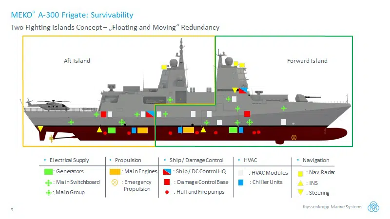Parte de sus características princípiales ya han sido probadas y se encuentran en uso en otros buques construidos por TKMS. Por ejemplo, las MEKO A-300 estarán divididas en dos secciones principales, como sucede con las fragatas F125 en servicio con la Marina Alemana. Esta características permite mejorar las capacidades para el combate contra incendios, como protección NBC. A su vez, tanto el armamento como equipos y sensores se encuentran instalados en dos islas diferentes, lo que permitirá a la fragata continuar operando y combatiendo de presentarse alguno de estos escenarios.