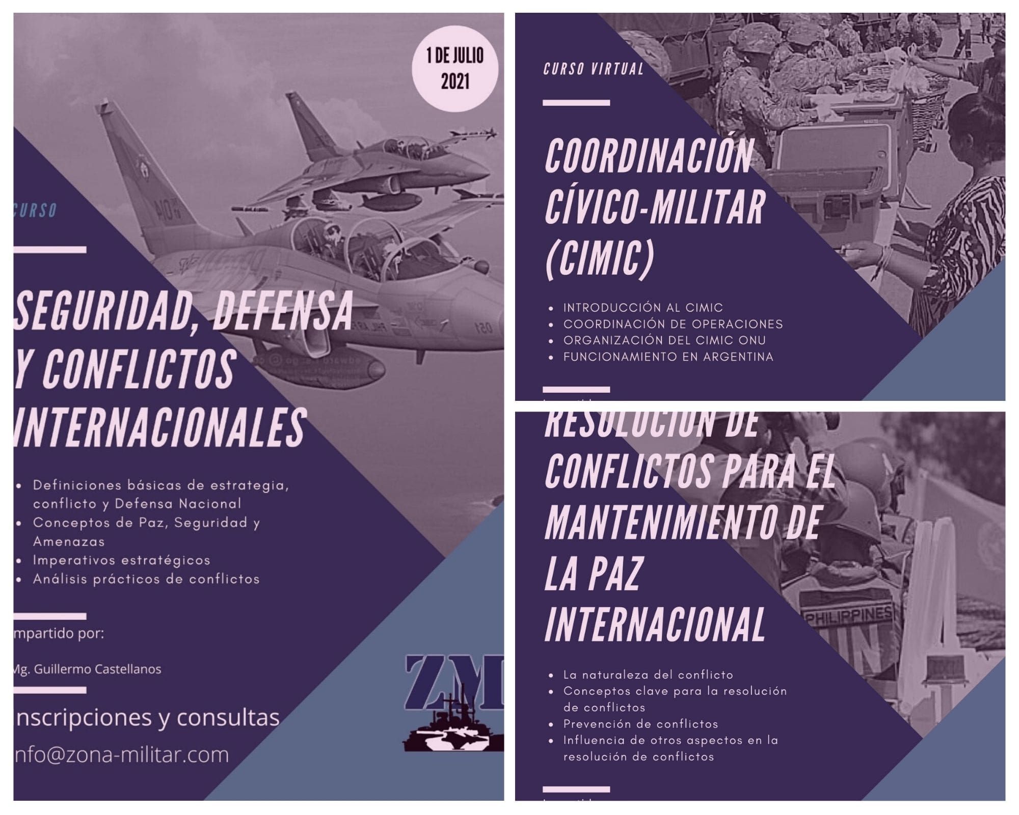 En función del objetivo del portal de generar un espacio de debate sobre los temas de Defensa, promoviendo la participación de la ciudadanía, construyendo un canal de comunicación e información que acerque a civiles y militares y, sobre la base del convencimiento respecto a que la capacitación y el estudio constituyen dos aspectos fundamentales que contribuyen a la formación y al perfeccionamiento de las personas, Zona Militar decidió lanzar durante el año 2021 una serie de cursos intensivos de capacitación relacionados con el conflicto, la estrategia, la defensa, el mantenimiento de la paz y la coordinación cívico – militar, que están abiertos al público en general, sin mayores exigencias en su ingreso que el deseo de querer aprender y con un arancel más que accesible.
