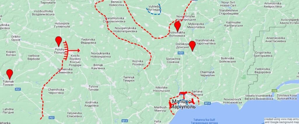 En el sur la situación sigue desarrollándose en la ciudad de Mariúpol. En el día de hoy se registraron combates, principalmente en el distrito este, conformado por Levoberezhny. Las incursiones rusas están siendo llevadas adelante por efectivos de las milicias de la República Popular de Donetsk con la intención de avanzar hacía el centro de la ciudad. Entre los reportes comunicados por el ayuntamiento de la ciudad, han informado que la cifra de muertos entre la población civil viene aumentando. El último reporte indica que han perdido de la vida 1.582 civiles desde que inicio la invasión el 24 de febrero. Mientras tanto, reportes rusos afirman que sus fuerzas controlan la localidad de Volnovakha, ubicada en el norte de Mariúpol.